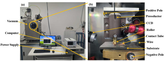 In the experiment, the pressure was controlled by the Z-axis movement of the platform, whose value was read by a pressure sensor FA402B (FIBOS, Changzhou, China) with an accuracy of 0.01 N. The printing process was recorded by a charge-coupled device (CCD) high-speed camera. To prevent oxidation and ensure the stability of the printing process, the experiment was carried out in a customized vacuum box (SHUAISHI, Xi’an China). After the vacuum box was closed, a double-stage pump TRIVAC D60T (LEYBOLD, Cologne, Germany) pumped atmospheric pressure in the vacuum box below 1 Pa and then started a semi-magnetic molecular pump TURBOVAC 90i (LEYBOLD, Cologne, Germany) to pump atmospheric pressure in the vacuum box to 7 × 10−2 Pa and keep it below 7 × 10−2 Pa. A high-precision vacuometer ITR90N (LEYBOLD, Cologne, Germany) was used to ensure the accuracy of the vacuum degree in the vacuum box. Clamps and fixtures firmly clamped the base plate to prevent it from moving or deflecting during welding.
