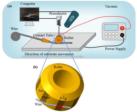 In this study, a SP-JHAM experimental system was built, whose schematic diagram is shown in Figure 2a. According to the scholars’ research and previous experimental experience, the copper roller was specially designed in this study [27,35] (as shown in Figure 2b). To save materials and convenience, multiple planes were milled on one roller (shown in the dark area in Figure 2b). During the printing process, the roller was fastened by nuts and screws and did not rotate, which ensured stable contact between a plane and wire and accomplished sliding forming. Multiple planes were milled on one roller because after a plane was damaged, it was only necessary to lose nuts and screws holding the roller and change one plane rather than a whole roller. The contact between the red part of the wire and the roller is the contact between the cylinder and the plane, while the rest of the wire and the roller are not in contact. The contact area between the wire and the roller can be changed by controlling Ls.