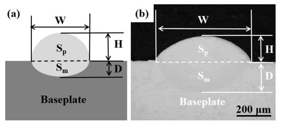 Figure 3 defines the main parameters of a typical single-pass cross-sectional geometry, with the upper part being the melting area of the wire and the lower part being the molten pool. The main measured parameters include melting width (W), melting height (H), and melting depth (D). The aspect ratio and dilution ratio of the cladding layer are two important indexes to evaluate the quality of the printed layer, which can be used to evaluate the three-dimensional stacking ability of the printed layer [36]. The aspect ratio of the printed layer refers to the ratio of the width to the height of the cladding layer, which has an important effect on multi-pass lapping. The larger the aspect ratio of the printed layer, the smaller the lapping area, the better the forming quality of the printed layer, and the stronger the lateral expansion ability will be [37]. If the dilution ratio is too high, the base material components will diffuse too much in the melting layer, which will easily lead to cracking of the melting layer, or defects such as air holes, thereby reducing the performance of the printed parts. The smaller the dilution ratio is, the stronger the vertical expansion ability is. However, if the dilution ratio is too small, the printing layer and the substrate will not be firmly bonded and will be easy to peel off [38]. The aspect ratio and dilution ratio are shown in the specific Formulas (5) and (6),