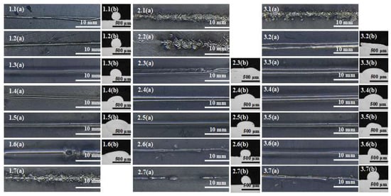 3.1. Effects of Process Parameters on Surface Appearance and Cross-Section Geometry