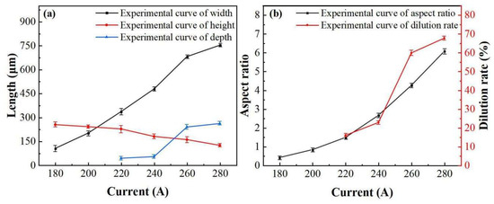 Effect curve of current on cross-section geometry: (a) Effects of current on width, height and depth, and (b) effects of current on aspect ratio and dilution rate.