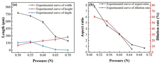 Effects curve of pressure on cross-section geometry: (a) Effects of pressure on width, height and depth, and (b) effects of pressure on aspect ratio and dilution rate.