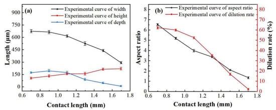 Effects curve of contact length on cross-section geometry: (a) Effects of contact length on width, height and depth, and (b) effects of contact length on aspect ratio and dilution rate.