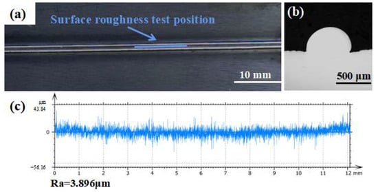The surface roughness of 3D printed parts is an important standard to evaluate the surface quality of parts, which determines the surface effect and overall quality of 3D printed parts. Lower roughness results in better wear and corrosion resistance of the parts and greatly reduces the post-processing workload [42,43]. Figure 8a shows the macroscopic appearance under the optimal process parameters, showing that the surface is smooth, the printing is continuous and the width is uniform. The surface roughness is measured and calculated based on ISO4287. Figure 8b displays the surface contour extracted from the layer scanned by the confocal microscope along the printing direction, with an average surface roughness (Ra) of 3.896 μm, which is better than that of WAAM: 200 μm [44], EBAM: 15 μm [45], and LMD: 8 μm [46].