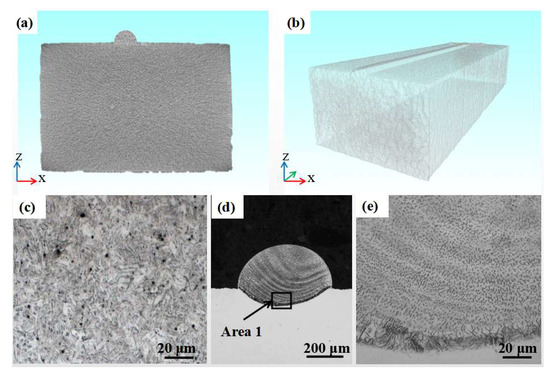 In the process of additive manufacturing, the wire melts, precipitates, and solidifies, thereby realizing metallurgy; the whole process is completed in a very short time, and the formed parts are prone to defects, such as holes, cracks, spheroidization and splash, which seriously affect the quality and performance of printed parts. Through industrial CT, the internal defects of objects can be nondestructively detected, and defects such as holes and cracks of parts can be visually and accurately observed [47,48,49,50]. Figure 9a,b show CT scanning results. The industrial CT test of the printed samples found that there are no typical defects such as holes and cracks (it should be pointed out that if there are holes and cracks, the results will be displayed in bright colors). Figure 9d,e show the micro-morphology of the printing layer cross-section, demonstrating that the wire and the substrate are completely metallurgically bonded.