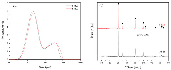 The particle size distribution of the homemade YSZ powder after grinding is shown in Figure 1a. 5YSZ and 8YSZ powders have similar particle size distribution, with d50 between 2–3 μm, and the specific surface area is 8.882 m2/g for 5YSZ and 9.854 m2/g for 8YSZ. Figure 1b shows the XRD plots of both powders, and it can be seen that both powders have no monoclinic phase; they are both tetragonal and cubic phases.