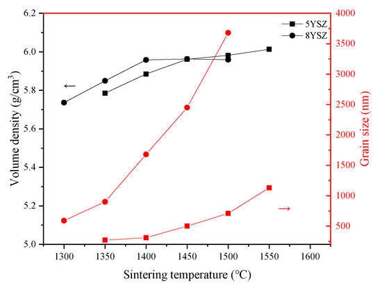 Note: t: holding time, T1: a high temperature, T2: a low temperature, ρv: volume density, ρr: relative density, G: grain size. The relative density of 5YSZ is calculated according to 6.0326 g/cm3 theoretical density and 8YSZ is according to 5.99 g/cm3 theoretical density [33].