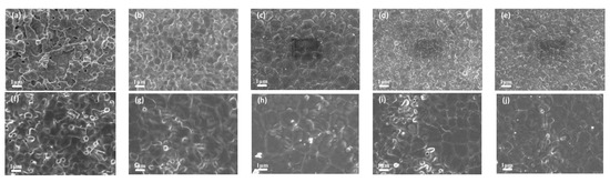 SEM under different sintering modes under 2 h holding time: (a) 5YSZ-1400 °C, (b) 5YSZ-1450 °C, (c) 5YSZ-1500 °C, (d) 5YSZ-1450-1400 °C, (e) 5YSZ-1500-1400 °C, (f) 8YSZ-1350 °C, (g) 8YSZ-1400 °C, (h) 8YSZ-1450 °C, (i) 8YSZ-1400–1350 °C, (j) 8YSZ-1450–1350 °C.