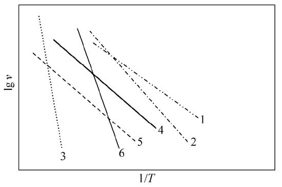 Schematic representation of Arrhenius plot for sintering mechanisms [30,34] (1—Surface diffusion mechanism; 2—body diffusion mechanism; 3—evaporation and accumulation mechanism; 4—grain boundary diffusion mechanism; 5—Grain boundary migration mechanism; 6—Intersection migration mechanism).