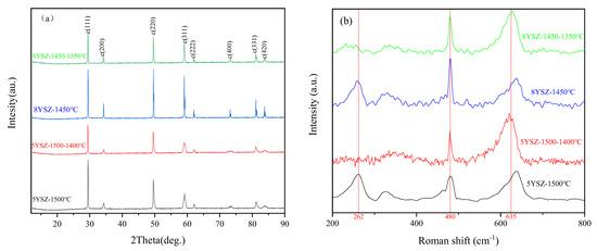 (a) XRD patterns; (b) Raman patterns of four YSZ samples under 2 holding time.