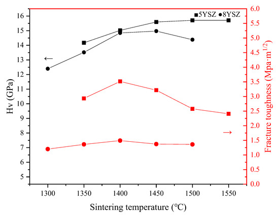 Figure 6 shows the trends of hardness and fracture toughness of the two ceramic samples in CS process at different sintering temperatures. The fracture toughness of the 5YSZ and 8YSZ ceramic samples increased and then decreased with the increase in sintering temperature, and reached the maximum value at 1400 °C. The maximum hardness of 5YSZ ceramic samples in the CS process was 15.709 GPa, and the maximum fracture toughness was 3.514 MPa·m1/2, while the maximum hardness of 8YSZ ceramic samples was 14.972 GPa and the maximum fracture toughness was 1.491 MPa·m1/2. Table 3 shows the hardness, toughness, and elastic modulus values of the ceramic samples in the TSS process. The maximum fracture toughness increased to 4.034 MPa·m1/2 and 2.126 MPa·m1/2. TSS sintering improved the fracture toughness of the samples, which was mainly due to the grain refinement effect brought about by TSS. The finer the grain size, the larger the grain boundary area, and the more curved the grain boundary is, the more unfavorable to the crack extension, and the stronger the resistance to cracking. The hardness of the two ceramic samples in the TSS process is slightly lower than that in CS process because the relative density is slightly lower.
