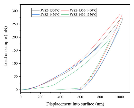 The annular nanoindentation leads to quasi-plastic deformation, which results in localized aggregation of zirconia crystals with micro-cracks and large cracks along the indentation edges. Figure 7 shows the loads and deflections of the four ceramic samples. The displacements of the four ceramics into the elastic–plastic phase are almost the same, but the TSS process sample has a larger deflection in the plastic phase. The modulus of the elasticity of the 5YSZ and 8YSZ ceramic samples in the CS process is 223.545 GPa and 218.602 GPa, respectively, while the modulus of elasticity of the 5YSZ and 8YSZ ceramic samples in the TSS process is 238.075 GPa and 233.408 GPa, respectively. The average grain size determines the deformation zone around the residual indentation. The decrease in the average grain size is associated with a significant decrease in contact hardness, Young’s modulus, plasticity, elastic deformation fraction and cracking caused by machining, and higher elastic and plastic displacements than that in CS. The results indicate that grain refinement is beneficial to improve the elastic deformation capacity of the material.