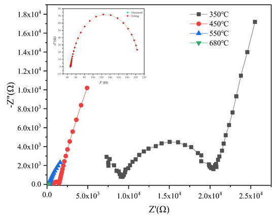 Impedance spectra usually separate grains, grain boundaries, and electrodes in polycrystalline systems [38]. Figure 8 shows the Nyquist impedance plots for 8YSZ-1450 °C ceramic at different temperatures, with the appearance of two depressed arcs that were attributed to the contribution of grains and grain boundaries. Above 450 °C, the high-frequency grain arcs gradually disappear, and only the grain boundary arcs and low-frequency tails are present, which is due to the electrode surface favoring electron transfer and the high electron activity of the electrode material. As the test temperature increases, the arc moves to lower frequencies. With the growth increase in the test temperature, the grain boundary barrier is broken. At this time, the resistivity is mainly determined by the grain resistivity, and the grain boundary arc disappears, leaving only a semicircle arch.. The equivalent circuit used is [CR][CR][CR] [39], which is a good fit.