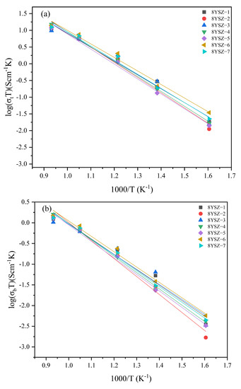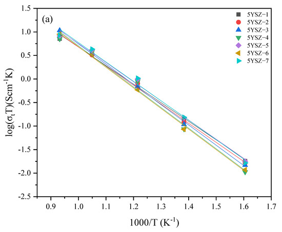 Figure 9 and Figure 10 show the total conductivity, grain conductivity, and grain boundary conductivity of the different samples at different test temperatures. The sample code, total conductivity, and calculated activation energy for oxygen ion conduction are shown in Table 4. Moreover, logσT shows an excellent linear relationship with 1000/T. The total conductivity of ceramics obtained at different sintering temperatures at low temperatures varies greatly and tends to increase with an increase in test temperature. At 680 °C, the total conductivity of 5YSZ-7 is the highest, 4.52 × 10−3 S/cm, which increased by 28.41% compared with 5YSZ-1. At the same time, 8YSZ-6 is 7.87 × 10−3 S/cm, which increased by 26.12% compared with 8YSZ-2. At 680 °C, the grain boundary resistance is small, and the total resistance is mainly affected by the grain resistance. The grain resistance can be greatly reduced through TSS, thus reducing the grain resistance and improving the total conductivity. The activation energy of the grain conductivity of 5YSZ ceramics in the TSS process is lower than that in the CS process, while the activation energy of grain boundary conductivity is the opposite, and the activation energy of total conductivity is lower in CS process. The change rule of the activation energy of the grain conductivity of 8YSZ ceramics is consistent with that of 5YSZ ceramics; however, the total conductivity and grain boundary conductivity are slightly different.