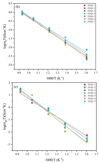 (a) Total conductivity, (b) grain conductivity, (c) grain boundary conductivity of seven 5YSZ ceramics.