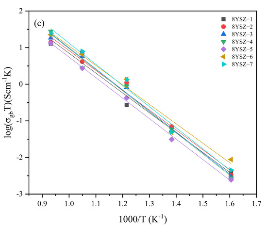 (a) Total conductivity, (b) grain conductivity, (c) grain boundary conductivity of seven 8YSZ ceramics.