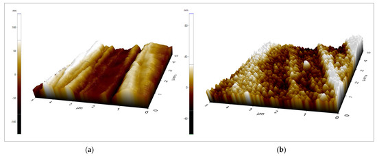 The surface topography of (a) 3−YZP and (b) IC surfaces., areas of 5 µm × 5 µm were captured. The z scale bar (a) −100–100 nm; (b) −40–80 nm.