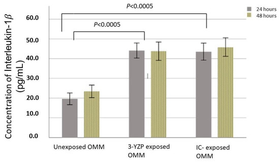 Figure 2 shows the concentration of IL-1β expressed when in contact with 3-YZP and IC. For 24 h of contact, the unexposed model released a statistically significantly lowered amount of IL-1β (19.59 ± 3.88 pg/mL) compared to both 3-YZP-exposed (44.09 ± 3.65 pg/mL) and IC-exposed (43.52 ± 4.14 pg/mL) oral mucosal models. The difference was also significant for 48 h of contact compared to the blank model. The concentration of IL-1β measured after 48 h on contact was 23.38 ± 4.17 pg/mL, 43.74 ± 4.45 pg/mL and 45.85 ± 4.47 pg/mL for the unexposed model, 3-YZP-exposed and IC-exposed oral mucosal model, respectively. However, the IL-Iβ expression between 3-YZP and IC was not statistically significant (0.77, 95% CI (−3.5 to 5.07), p = 0.892). It is interesting to note that from this chart (Figure 2), the prolonged contact with 3-YZP did not increase the amount of IL-1β released.