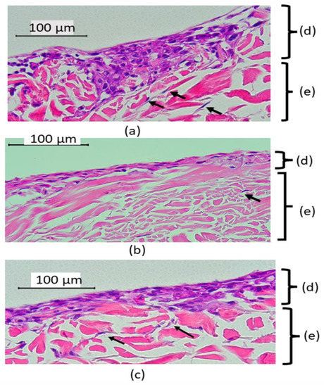 However, this study also had some limitations. The histological analysis of the models was assessed by more than one investigator who was not blinded to the nature of the treatment the tissue had received. This could have potentially caused bias. Furthermore, only one pro-inflammatory cytokine was reported in this current research. The potential use of other interleukins, such as IL-6 [61], IL-8 and tumour necrosis factor-α [62] should be explored in the biocompatibility testing of the newly developed material. The IL-6, the pro-inflammatory cytokine, is also essential for mitogenic and proliferative effects on keratinocytes during wound healing and tissue remodelling [61].