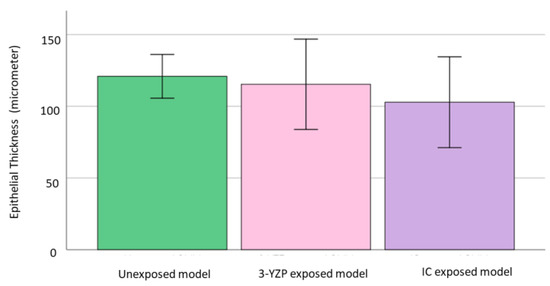 Graph reported on the epithelial thickness of unexposed model, 3-YZP and IC-exposed model. Error bars indicate standard deviation (SD).