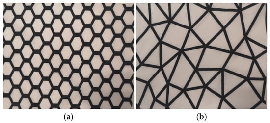 Two PES-EL woven fabrics with a plain weave, differentiated by their graphene-printed patterns, were considered in this study. According to the technical information from the textile manufacturer, a prepared rOxide graphene was purchased and printed directly on the fabric substrate, using two patterns hereafter called honeycomb (HC) and spiderweb (SW), as shown in Figure 1. Structural and physical parameters of the two fabrics are shown in Table 1 and were assessed as further described in Section 2.2.1. Figure 2 shows SEM images of the PES-EL fabrics with a HC graphene pattern (a), (b), and SW graphene pattern (c) and (d).
