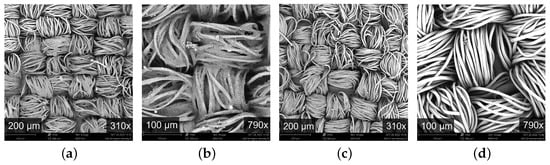SEM images of PES-EL fabric with (a) honeycomb (HC) graphene pattern with resolution ×310; (b) honeycomb (HC) graphene pattern with resolution ×790; (c) spiderweb (SW) graphene pattern with resolution ×310 and (d) spiderweb (SW) graphene pattern with resolution ×790.