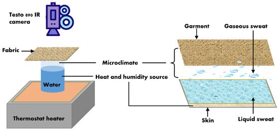 °C temperature, simulating human skin temperature, with the graphene pattern facing the heated water without touching it. The camera was positioned on a level tripod, perpendicular to the region of interest, at a distance of about 25 cm. Thermograms and video’s were recorded and analyzed offline by the Testo software IRSoft version 4.5. The emissivity was set at 0.95. The heat dissipation along the HC and SW-graphene circuit was monitored during one minute exposure to heat. To assess the fastest heat distribution along the two graphene circuits, the temperature profile along a specified horizontal line across the IR thermograms was computed for both fabrics and the temperature gradient at certain time intervals was calculated. The instrumental setup used to assess the heat dissipation along the graphene circuit of the fabrics is illustrated in Figure 3.