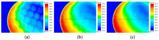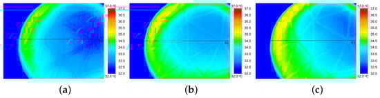 In addition to the thermal conductivity indexes (TCC and TCR) calculated by FTT, the thermal properties of the fabrics were investigated by IR-imaging. The IR-thermograms in Figure 4 and Figure 5 display the temperature distribution on the surface of the HC and SW fabrics, respectively, after 10 s (a), 20 s (b) and 30 s (c) exposure to heat. The temperature of the fabrics varies roughly between 32 °C (blue color) and 37 °C (red color).