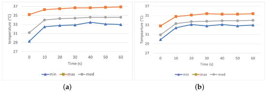 Temperature profile (minimum, maximum, and median) along a horizontal line crossing the IR thermogram (Figure 4 and Figure 5) was computed and is shown in Figure 6 for fabric with HC pattern (a) and SW pattern (b), respectively. In general, it can be seen that the maximum temperature reached on the surface of SW fabric was slightly lower as compared with the HC fabric.