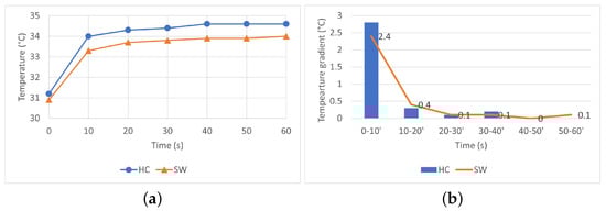 Analysis of thermograms showed a higher temperature of the HC fabric surface after 1 min of heat exposure, as shown in Figure 7a. The temperature of fabric HC increased steeper with about 2.5 °C in the first 10 s and additional 0.4 °C after another 10 s following the fabrics exposure to heat, Figure 7b. The results show that fabric HC has a better heat dissipation and faster response than fabric SW. The results suggest that tight-fitted sportswear with HC-pattern have greater potential to rapidly spread the heat from hot skin areas and would, therefore, offer a better sensation of cooling than fabrics SW.