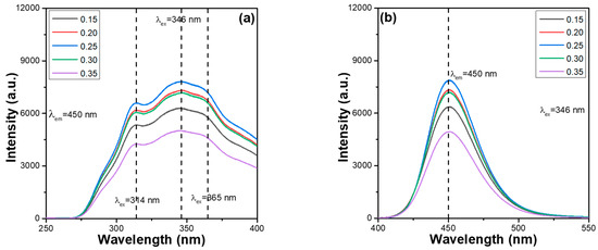 One of the objectives of this study was to find the concentration quenching effect of CaxMg2-xSi2O6:Eu2+-based phosphors. To this end, CaMgSi2O6 was used as the host material, CaMgSi2O6:yEu2+ was used as the composition, and the Eu2+ ion concentration was altered from 0.015 to 0.035 (y = 0.015–0.035). The PLE spectra of the synthesised CaMgSi2O6:yEu2+ phosphors were measured as a function of the Eu2+ concentration; the results are presented in Figure 1a. The PLE spectra were monitored at 450 nm and recorded at room temperature in the spectral region of 250–400 nm. The emission intensities of the entire PLE spectra of the CaMgSi2O6:yEu2+ phosphors initially increased as the Eu2+ ion concentration increased, peaking at y = 0.025 and then decreasing as the Eu2+ ion concentration increased further. These results indicate that the Eu2+ concentration has a substantial effect on the optical properties of Eu2+-doped CaMgSi2O6 (CaxMg2-xSi2O6) phosphors. Subsequently, we prove later that the concentration quenching effect is the underlying cause of the degeneration in the emission intensities across the entire PLE spectra of the CaMgSi2O6:yEu2+ phosphors. As can be seen in the results presented in Figure 1a, we found that CaMgSi2O6:yEu2+ phosphors have broad PLE spectra with three unapparent absorption peaks, in which the wavelengths are located at 314, 346, and 365 nm. For all the CaMgSi2O6:yEu2+ phosphors, the PLEmax value was reached at 346 nm, and the PL spectrum excited by 346 nm recorded the PLmax value. Therefore, 346 nm was used as the excitation wavelength (λex) of CaMgSi2O6:yEu2+ phosphors in all further analyses.