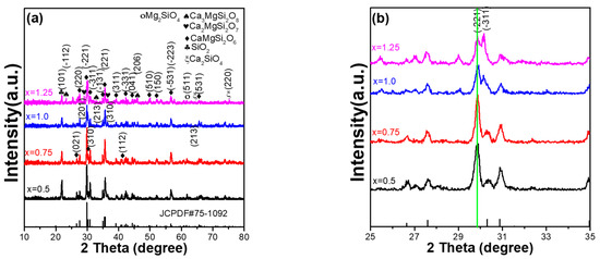 X-ray diffraction (XRD) patterns can be used to analyse the crystalline structure of CaxMg2-xSi2O6:0.025Eu2+ phosphors. Therefore, the XRD patterns of synthesised CaxMg2-xSi2O6:0.025Eu2+ phosphors were measured as a function of Ca content and are presented in Figure 2. The diffraction peaks for standard JCPDS No. 75-1092 are also indexed in Figure 2a, and all synthesised CaxMg2-xSi2O6:0.025Eu2+ phosphors matched with these diffraction peaks, although there are some deviations in the diffraction intensities of the diffraction peaks. These results indicate that the mainly crystal structure of all the synthesised CaxMg2-xSi2O6:0.025Eu2+ phosphors is monoclinic, with a space group C2/c structure, which is in good agreement with the standard JCPDS No. 75-1092. For Ca0.5Mg1.5Si2O6:0.025Eu2+ and Ca0.75Mg1.25Si2O6:0.025Eu2+ phosphors, all the diffraction peaks of the CaMgSi2O6 phase in the two synthesised powders were revealed, and the SiO2 phase was also observed, as can be seen in Figure 2a. Apparently, as the CaO content of CaxMg2-xSi2O6:0.025Eu2+ phosphors increased from x = 0.75 to x = 1.25, the diffraction intensity of the SiO2 phase decreased. As the CaO content increased further, many secondary phases were observed in the synthesised CaMgSi2O6:0.025Eu2+ and Ca01.25Mg0.75Si2O6:0.025Eu2+ phosphors, including SiO2, Ca2SiO4, Ca2MgSi2O7, and Ca3MgSi2O8. Figure 2a also shows that, as the value of x increased from 0.75 to 1.25, the diffraction intensities of all secondary phases increased with an increase in the CaO content. The results presented in Figure 2b show that as the CaO content of CaxMg2-xSi2O6:0.025Eu2+ phosphors increased from x = 0.5 to x = 1.25, there was no apparent change in the 2θ value of the main (221) peak, and the primarily crystalline peak of the CaxMg2-xSi2O6:0.025Eu2+ phosphors changed from a (221) peak to a (−311) peak. The results presented in Figure 2a also indicate that an increase in the CaO content does not alter the primary crystalline phase (monoclinic), but there is an apparent increase in the number of secondary phases. Figure 2b also shows that Ca0.75Mg1.25Si2O6:0.025Eu2+ phosphor had the smallest full width at half maximum (FWHM). The results indicate that the CaO content affects the resulting composition of CaxMg2-xSi2O6:0.025Eu2+ phosphors, consequently transmitting their photoluminescence properties.