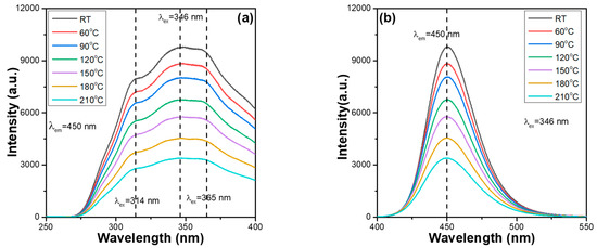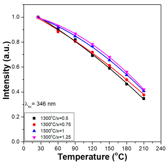 However, from the PLE spectra, we found that all CaxMg2-xSi2O6:0.025Eu2+ phosphors also have three unapparent absorption peaks with wavelengths at 314, 346, and 365 nm. Because the 346 nm peak also had the highest intensity, it was used as the excitation wavelength of the CaxMg2-xSi2O6:0.025Eu2+ phosphors. The thermal stabilisation problem of synthesised phosphors is a crucial factor for their practical application in package LEDs. This is because when the excitation light source of LEDs emits heat, the thermal quenching effect occurs, reducing the emission properties and the efficiencies of the fabricated LEDs. The PLE and PL spectra of the synthesised CaxMg2-xSi2O6:0.025Eu2+ phosphors were measured at different temperatures. However, when the temperature increased, the photoluminescence properties of all the synthesised CaxMg2-xSi2O6:0.025Eu2+ phosphors exhibited a similar variation trend. Therefore, only the measured values of the Ca0.75Mg1.25Si2O6:0.025Eu2+ and CaMgSi2O6:0.025Eu2+ phosphors were used as representative values. The measured values for the PLE and PL spectra are presented in Figure 3 and Figure 4, respectively. The PL properties of CaxMg2-xSi2O6:0.025Eu2+ phosphors were also measured from 30 to 210 °C, with a 30 °C step below the excitation wavelength of 346 nm to find the effect of temperature on the variations in the PLmax values. By heating CaxMg2-xSi2O6:0.025Eu2+ phosphors from ~30 to 210 °C, a continuous decrease in the emission intensities of the entire PLE and PL spectra were readily observed. Shifts in the emission wavelengths of the entire PLE and PL spectra were not found for all the CaxMg2-xSi2O6:0.025Eu2+ phosphors (Figure 3 and Figure 4). Both Figure 3 and Figure 4 also show that the relative emission wavelengths matching the PLEmax values do not change as the measured temperature increases. These results indicate that although the CaO content may change, all CaxMg2-xSi2O6:0.025Eu2+ phosphors have the same excitation and emission mechanisms. These results are presented in Figure 3 and Figure 4, and show that the colour of the emitted by CaxMg2-xSi2O6:0.025Eu2+ phosphors is very stable and does not change with temperature.