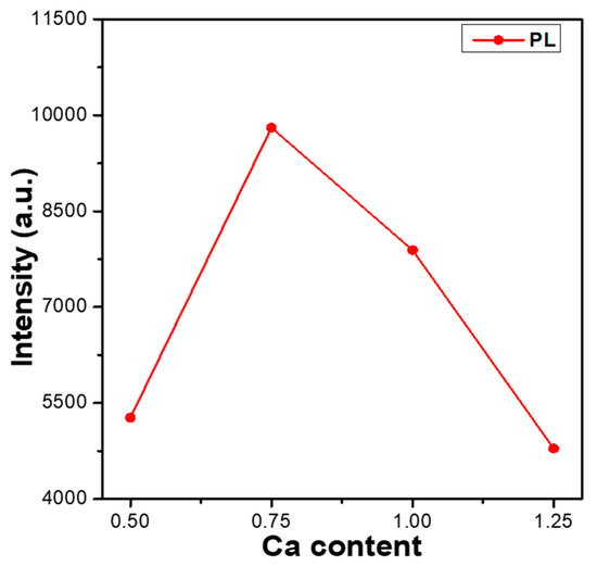 Comparing the measured values in Figure 3 and Figure 4, we found that the emission intensities of the entire PLE and PL spectra and the PLEmax and PLmax of all CaxMg2-xSi2O6:0.025Eu2+ phosphors decreased as the value of x value increased from 0.75 to 1.0. These results indicate that the Ca content affects the emission intensities of the entire PLE and PL spectra and the PLEmax and PLmax values of CaxMg2-xSi2O6:0.025Eu2+ phosphors. Therefore, the entire PLE and PL spectra of CaxMg2-xSi2O6:0.025Eu2+ phosphors for x = 0.50 to 1.25 were measured, and the variations in the PLmax values are compared in Figure 5. As can be seen in Figure 5, the PLmax values of CaxMg2-xSi2O6:0.025Eu2+ phosphors first increased as the CaO content increased, peaking at a maximum at x = 0.75, and then decreasing as the CaO content increased further. These results indicate an important finding: that the CaO content has a crucial effect on the photoluminescence properties of Eu2+-doped CaMgSi2O6-based phosphors. Hence, the entire PL spectra and the PLmax values of Eu2+-doped CaMgSi2O6-based phosphors can be enhanced by adjusting the CaO content. The reason behind the Ca0.75Mg1.25Si2O6:0.025Eu2+ phosphor having the highest PLmax values is not well known. However, from the XRD patterns of the CaxMg2-xSi2O6:0.025Eu2+ phosphors, we found that the Ca0.75Mg1.25Si2O6:0.025Eu2+ phosphor has the lowest residual SiO2 phase and a low number of secondary phases. This may be the underlying reason for the result.