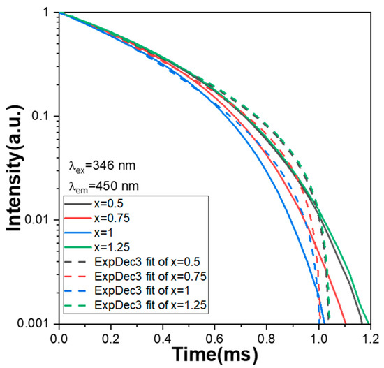 The decay time of all CaxMg2-xSi2O6:0.025Eu2+ phosphors is defined as when the intensity of the PLmax decreases from its maximum value to 36.8% (1/e). In this study, the optimum wavelength to excite the CaxMg2-xSi2O6:yEu2+ phosphors was 346 nm, and the wavelength to measure the intensity decay was 450 nm because the excitation and emission peaks of all the CaxMg2-xSi2O6:yEu2+ phosphors were at those wavelengths. The measured decay time curves of CaxMg2-xSi2O6:0.025Eu2+ phosphors are presented in Figure 8, from which the decay time was measured to be 0.85, 0.82, 0.79, and 0.86 ms for the x values x = 0.5, 0.75, 1.0, and 1.25, respectively. The decay time curves of all the CaxMg2-xSi2O6:0.025Eu2+ phosphors presented in Figure 8 have one exponential decay stage and similar decay changes. This result further indicates that all CaxMg2-xSi2O6:0.025Eu2+ phosphors have a similar emission mechanism. Although the Ca content has an apparent effect on the PLE and PL properties of all CaxMg2-xSi2O6:0.025Eu2+ phosphors, it has no apparent effect on the crystalline structure of all the CaxMg2-xSi2O6:0.025Eu2+ phosphors. Thus, it has no apparent effect on the variations in decay time curves. A curve-fitting technology was used to simulate the decay processes for the PL intensities of all the synthesised CaxMg2-xSi2O6:0.025Eu2+ phosphors, and the decay time curves were fitted using one exponential component, which is expressed as the following equation: