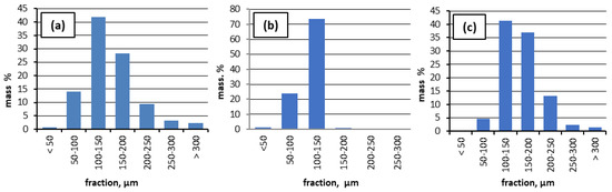 Figure 2, the CS used in the experiments are predominantly (more than 40%) in the 100 to 150 μm size range. In the case of CS1, up to 14% are particles of <100 μm, and about 27% are particles of >150 μm. In the case of CS2, particles with average sizes of 100–150 μm are mainly present, while in CS3, particles (up to 42%) with sizes of 100–150 μm and particles of >200 μm (up to 15%) are observed. From a granulometric point of view, a more even distribution of CS particles is seen in the case of CS2: above 74% with dimensions from 100 to 150 μm.