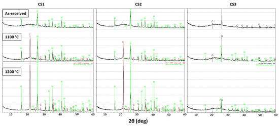 To determine the phase composition of the CS and how it is affected by heat treatment, X-ray diffraction (XRD) phase analysis was performed on as-received and heat-treated CS. The heat treatment of the CS was performed at 1100 and 1200 °C in accordance with the process flow shown in