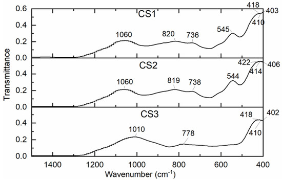 −1 appears, which is attributed to valence oscillations in the bridge links in the Si-O-Si(Al) crystal lattice. A small maximum also indicates the presence of quartz in the case of CS3 at 778 cm