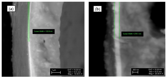 Figure 8b). However, multiple measurements noted that the layer thickness of Ti (for Ti@CS) is between 100 and 350 nm; and in the case of Ti-TiN@CS, the layer of TiN nitride is between 90 and 350 nm and Ti between 150 and 380 nm. The deposited Ti and Ti-TiN coatings in all the observed specimens are intact and have no cracks, pores, or delamination