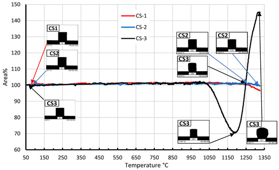 Figure 9, in the patterns made of CS1 and CS2, the deformation is negligible until the 1200–1325 °C temperature interval, but after this temperature, a slight shrinkage can be observed, which could be due to the deformation of the CS and their mutual compaction (softening begins).