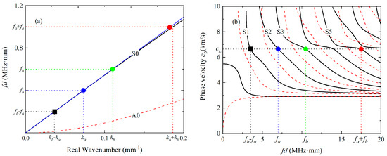 Lager mixing zones are probably required for investigating the phase-mismatching phenomena in nonlinear mixing of Lamb waves since the energy transfer from the primary waves to the difference- or sum-frequency components only occur in the mixing zone. Therefore, the energy can be continuously transferred when the tone bursts a and b travel in the same directions and possess the similar group velocities. S0 modes at relatively low frequencies attract much attention since they have approximately equal phase and group velocities. Single S0 modes can be excited due to their almost non-dispersive properties, and they can be utilized to explore the phenomena of phase mismatching. S0 modes at 400 kHz and 600 kHz is chosen as the fundamental waves in the first mode triplet, as shown in Figure 1a. In addition, mode triplets that exactly meet the phase matching criterion can be selected from the Lamb waves at the longitudinal wave speed, since their frequencies equal to integer multiples of , where h is the thickness of the thin plate, and are the velocities of the transverse and longitudinal elastic waves [42]. S2 and S3 modes are chosen as the primary waves in the second mode triplet so that their difference and sum frequencies are different to those of higher harmonics, as illustrated in Figure 1b. Meanwhile, S2 and S3 modes have the largest group velocities at the frequencies and , and perhaps they can be easily separated from the other modes.