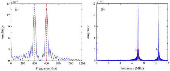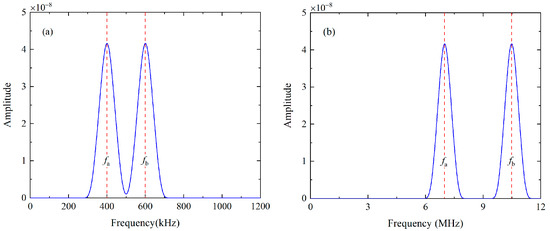Note that only the difference- and sum-frequency components can exist after the signal processing, as illustrated in Figure 6c,d.