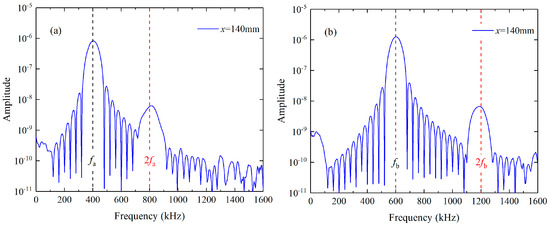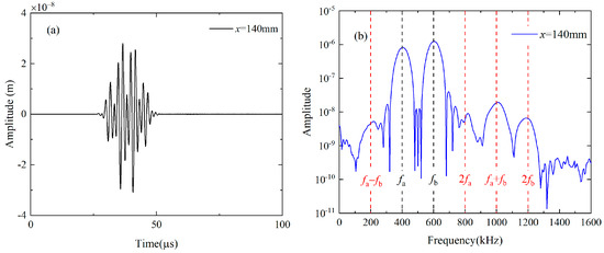 For the nonlinear mixing of S0 modes at 400 kHz and 600 kHz, the fundamental waves are simultaneously excited by applying the uniform longitudinal displacements on the left end of the plate. The excitation signal is a linear superposition of the 10-cycle and 15-cycle Hanning windowed sinusoidal tone bursts at 400 kHz and 600 kHz, and their frequency spectra are given in Figure 3a. Besides, the primary wave a or b is individually excited by imposing the uniform longitudinal displacements on the left end of the plate with the 10-cycle or 15-cycle Hanning windowed sinusoidal tone bursts at 400 kHz or 600 kHz, respectively. The displacement component U2 at 140 mm are recorded when both primary a and b are excited (denoted as Case A), and transferred into the frequency domain using the Fast Fourier Transform (FFT), as shown in Figure 4a,b Besides fundamental waves, components at difference, double and sum frequency also appears in Figure 4b. Note that difference- and sum-frequency components are probably generated from the nonlinear mixing of guided waves. To confirm this assumption, typical time-domain signals and corresponding frequency spectra are also obtained at the same position when primary a and b are separately excited (denoted as Case B and Case C). It is founded that only the second harmonics exist in propagating Lamb waves, as shown in Figure 5a,b. Therefore, the source of the difference- and sum-frequency components can be clearly identified. Next, the modes of the generated harmonics are confirmed based on the group velocities and wave structures (i.e., the normalized distribution of the displacement component U1 and U2 along y axis), which are compared with the theoretical values obtained by the software DISPERSE v2.0.20f [48]. The displacement component U1 and U2 on the surface are received from 80 mm to 200 mm at intervals of 20 mm. To obtain the difference- and sum-frequency components, the signals are then processed by the band-pass filters with a central frequency of 200 kHz and 1 MHz. These filtered signals are then utilized to calculate the group velocity. Relevant values of components at difference and sum frequency are 5450.66 m/s and 4951.27 m/s. Compared with the theoretical group velocities of S0 mode at 200 kHz (5465.54 m/s) and 1 MHz (5128.8 m/s), their errors are calculated as 0.27% and 3.46% respectively. In addition, the displacement component U1 and U2 are obtained along the thickness at intervals of 0.1 mm. These signals are band-pass filtered to obtain the difference- and sum-frequency components. Amplitudes of these components are then extracted from the filtered signals and normalized with the maximum. The distributions of their amplitude along the thickness agrees well with the wave structures of S0 mode at 200 kHz and 1 MHz respectively.