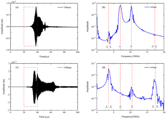 As for the second mode triplet in simulations, typical time-domain waveforms at x = 140 mm (a) within the time window (during 20 μs and 40 μs) are transferred into frequency domain (b) via the FFT; In addition, a group of time-domain signals within the time window (from 20 μs to 40 μs) are processed by the pulse-inversion technique (c) and the FFT (d).