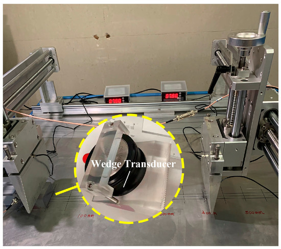 A designed fixture to ensure the collinear arrangement of transmitters and receivers, and maintain the constant contact pressure between two wedge transducers and plates.
