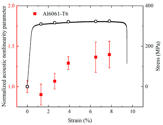 Both the pristine samples and damaged samples with different plastic deformation are measured by the selected mode triplet. The relationship of the normalized acoustic nonlinearity parameters and strain are shown in Figure 11. A dramatic increase of normalized acoustic nonlinearity parameters (around 50%) is observed at an early stage of plasticity (between 0% and 3.9%), followed by a gradual increase before the tensile strain reaches the value of 7.8%. It is reported that a number of dislocations can be generated during the plastic deformation of aluminum alloy [52], meanwhile significantly deformed grain, micro-void, and micro-cracks may also contribute to the variations of the normalized acoustic nonlinearity parameters [5].