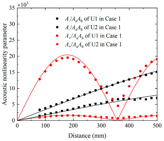 According to the theoretical analysis, the acoustic nonlinearity parameters of components at difference and sum frequency may oscillate with the propagation distance when the condition of synchronism is not exactly satisfied. These phenomena will also be numerically investigated in this section. To establish the relationship of the acoustic nonlinearity parameters and propagation distance, the time-domain signals recorded on the surface from 80 mm to 200 mm at intervals of 20 mm are utilized again. They are processed by the FFT to extract the amplitudes of fundamental waves Aa or Ab, the amplitudes of difference-frequency components A−, the amplitudes of sum-frequency components A+ and the amplitudes of second harmonics A2a or A2b. The acoustic nonlinearity parameters can be written as , , , and respectively. The acoustic nonlinearity parameters and of U1 and U2 versus the propagation distance are presented in Figure 12, in which the points and their fitting curves are obtained from the numerical data. The acoustic nonlinearity parameter of U1 and U2 remains bounded and oscillates with the same spatial periodicity. The relevant values equal to 350 mm, which are close to the theoretical results calculated by Equation (6), i.e., Lp = 357.28 mm. However, the acoustic nonlinearity parameter of U1 and U2 approximately exhibit a monotonic increasing trend with the propagation distance because their much longer spatial periodicities are around 2021.95 mm. In addition, there is a beat effect for the acoustic nonlinearity parameter and with the propagation distance, as shown in Figure 13a,b. The acoustic nonlinearity parameters or in Case 1 (i.e., primary waves a and b are simultaneously excited) are compared with the corresponding values in Case 2 or Case 3 (i.e., primary wave a and b are separately excited). Relevant spatial periodicity almost equals to each other and agrees well with the expected value obtained by Equation (6).