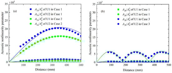 Acoustic nonlinearity parameters of second harmonics in Case 1 and Case 2 (a), as well as in Case 1 and Case 3 (b) as a function of propagation distance, which are also fitted by Equation (6).