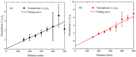 For the nonlinear interaction of S2 and S3 mode in experiments, the relationship of normalized acoustic nonlinearity parameters (a) or (b) and propagation distance, as well as their fitting lines.