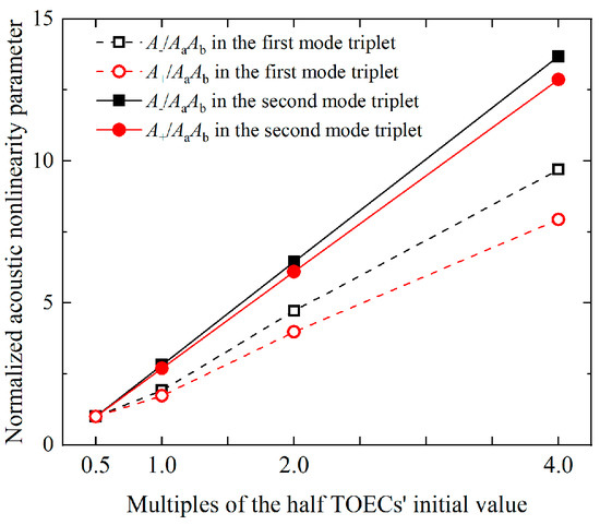 Variation of normalized acoustic nonlinearity parameters versus multiples of the half TOECs’ initial value.